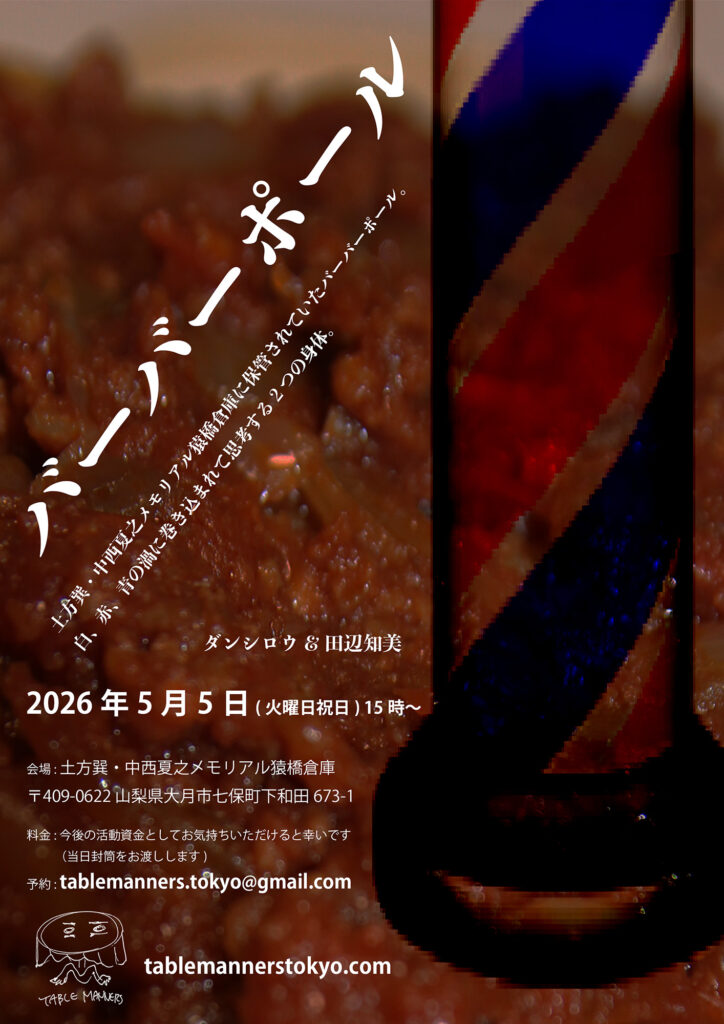 テーブルマナーズは、ダンシロウと田辺知美によって2023年に結成されたパフォーマンスユニットです。初公演は、アーツカウンシル東京の助成プログラム「トーキョークライシスプラン」にて上演された《テーブルマナー》。以降、土方巽・中西夏之メモリアル倉庫にて年1回のペースで新作を発表しています。